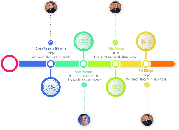 La falta de un pastor y un centro diocesano junto al abandono estatal que tenía el territorio al que pertenecían las parroquias que hoy día forman nuestra Diócesis, fueron las principales circunstancias que motivaron la creación de esta, como territorio desmembrado de las diócesis de Barrancabermeja, Facatativá y de la Arquidiócesis de Manizales; acontecimiento que tuvo lugar el 29 de marzo de 1984 por la bula Quod Iure Apostólica Sedes del papa Juan Pablo II. En esa misma fecha se nombró a Monseñor Fabio Betancur Tirado como primer obispo diocesano, después fue designado Monseñor Oscar Aníbal Salazar Gómez y en la actualidad estamos bajo el pastoreo de Monseñor Hency Martínez Vargas. Desde su creación se adelantan procesos de nueva evangelización y un constante trabajo por la paz, la reconciliación, el perdón y el desarrollo integral, bajo el lema: “Lanzando las redes en el nombre del Señor – construyamos la Diócesis de la paz”.